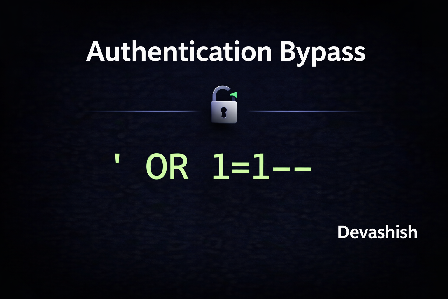 Imagine a door with a lock. Authentication Bypass means you get through without the key — not by breaking the lock, but by finding a hidden entrance, or by convincing the doorman you already showed your ID. With SQL injection, you tell the lock ' OR 1=1-- which makes it think any password is correct. The door opens. You are in.