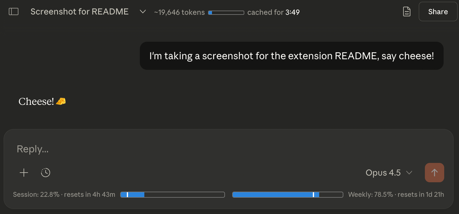 - Real-time Tracking: The extension displays your session and weekly limits directly inside each chat window.